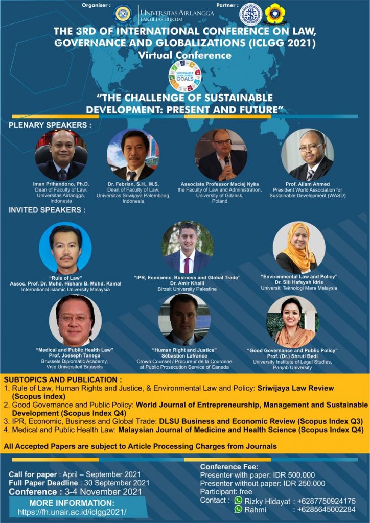 The President of WASD will be among the Keynote guest speakers at Airlangga’s Faculty of Law international conference in November 2021. The Third of International Conference on Law, Governance and Globalisation (The 3rd ICLGG) on 3-4 November 2021 will be hosted virtual by the Faculty of Law international, Airlangga University.